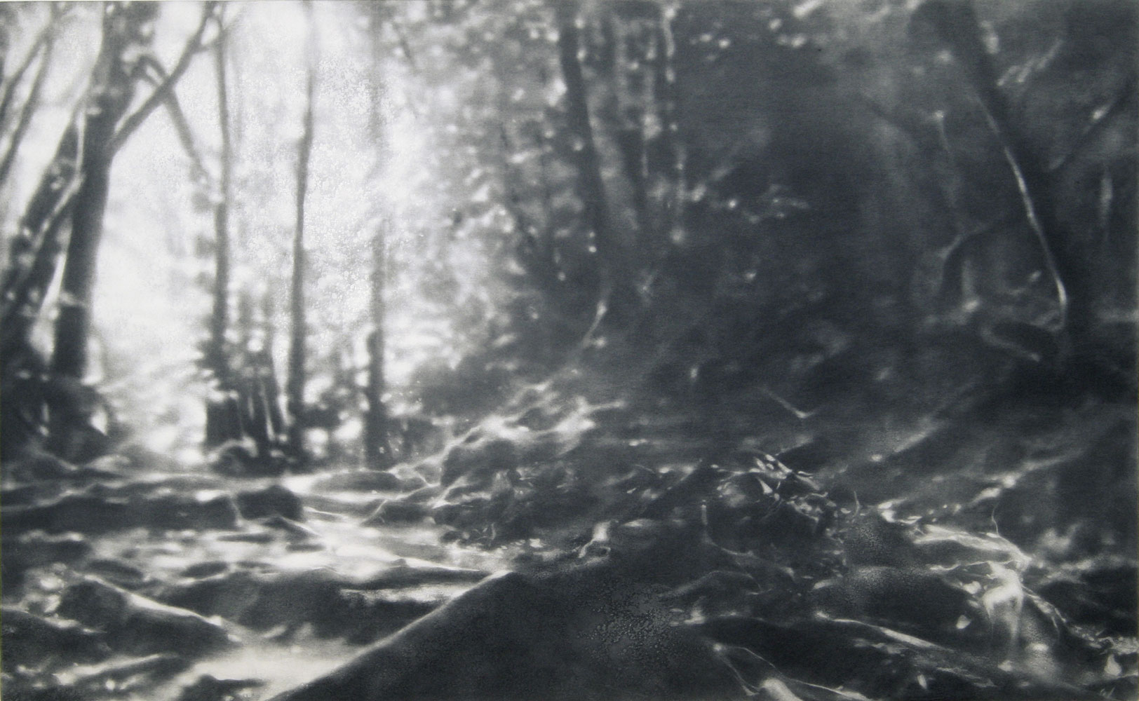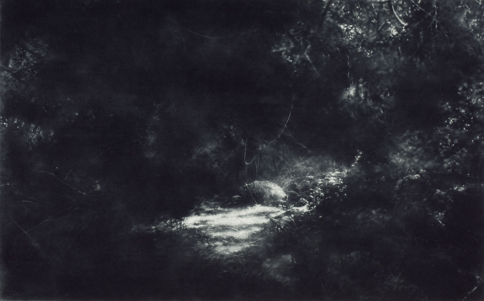 Using nature as his motif, Nojima strives to capture the emotional awe, peaceful flow of time and unique lighting that humans can experience when physically present in nature. What sparked Nojima’s interest in copperplate printing was his encounter with the German print artist Jorg Schmeisser, while studying oil painting at the Kyoto City University of Arts. Schmeisser’s unique view of the world expressed through his work fascinated Nojima, drawing him right into the world of copperplate printing. Nojima did not merely learn the techniques of printing from Schmeisser, but more importantly, he learned the joy of simply creating an image. Working closely with Schmeisser, Nojima was heavily influenced by Casper David Friedrich, an artist that Schmeisser himself liked. Friedrich was able to depict nature in its entirety. We experience deep emotions of sorrow and awe in nature, which are emotions that, once experienced, resonate with us forever. Friedrich captures precisely this in his images and this inspired Nojima to create powerful images as well, capturing the purity and grandness of nature.These pieces are landscape images of Yakushima, Japan. The details of the light shining through the leaves and the shadows they create brings about a sense of stillness and peacefulness, evoking the emotional sorrow and awe, which results in a powerful image that has captured all of nature’s beauty. For Nojima, the plate that he etches is an expression of his individual perspective, and the reversed image that is printed onto the paper is a different perspective. Therefore, a specific vision has both the internal and external perspectives and can be expressed by using the copperplate as a medium. The beauty of copperplate printing lies in the distinctive velvet-like gradations of colours, pressed between a space that is a mere 1mm in thickness. This unique form of printing allows for very meticulous expressions in the images, where the etching process dictates the thickness of the lines and thereby the tone of the piece, creating a very calculated expression of a vision in black and white.